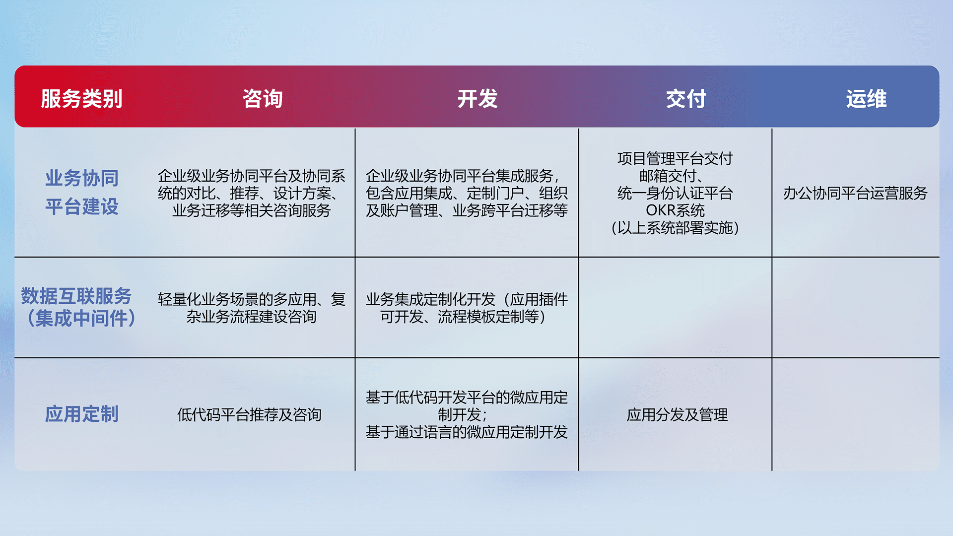 针对钉钉、、、、企微、、、IDaas等平台级产品提供产品的规划、、、、方案、、交付、、、定制化开发等服务,,实现如统一协同办公、、智能客户服务、、、混合会议管理、、智能数据查询、、等业务场景,,实现数字化转型。。